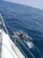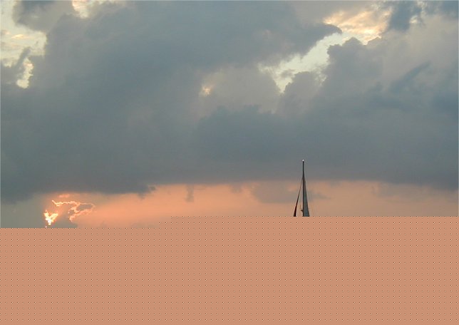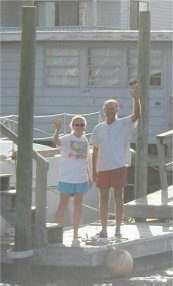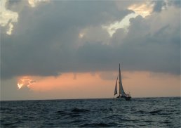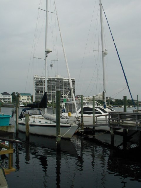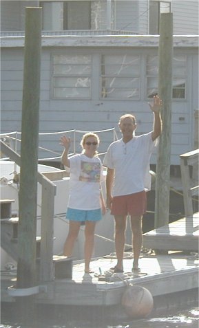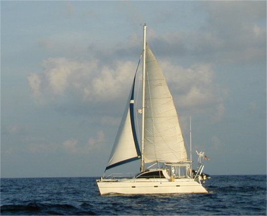 So now I was at West End, committed to singlehanding across the Gulf Stream to somewhere in the US, trying to decide when and where to cross over to. I was in a hurry to go home, and I did NOT want to go up the ICW in Georgia and South Carolina - lots of current and big tides and it takes a long time. So I am balancing that against my relative inexperience in passagemaking, particularly by myself, so I decide to go to Cape Canaveral, a trip of about 125 miles that I estimated that would take 20-24 hours. The next obstacle was weather. I did not want to cross over in rough conditions. So I spent the first day in West End getting the engine checked out. I was planning on leaving the next day - the forecast was for 10-15 knots of wind from the east with 3-5 ft seas. So I was at the fuel dock, topping off the tanks and looking at the whitecaps on the sea when who should pull into the marina, but Raymond and Aylin on Rhythm, some friends from my last trip down here. They had just crossed over from Florida and told me that the wind was blowing pretty hard, as I could see from the marina, so I decided to wait another day. The next day the wind was considerably less and the forecast was the same - so, saying goodbye to the Bahamas, I set out.