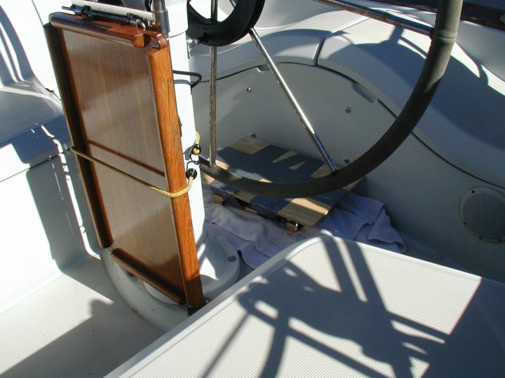 fix it! I also came up with a temporary solution to a problem I have had since I bought this boat. While standing behind the wheel, the dodger is exactly at my eye level, which requires me to either stand on my toes to see over it or duck my head (or sit down) and look through the plastic window, which distorts things too much. Up to now I have been putting the dodger down when I was steering a lot, but now that I am boating in cold weather, I don't want to lose the protection. So today while crossing the Sapelo Sound with the autopilot going, I rigged up my temporary fix. I took a small piece of thin plywood and an old wood box that Clementine oranges originally come in, and with duct tape rigged up a platform for me to stand on so I can see over the dodger. It works great! It was a lifesaver while hand steering through all the ranges in Georgia!