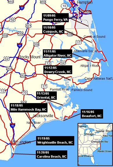 Luckily for me the predicted 20-25kt winds did not appear today. So I could cross the Albemarle Sound