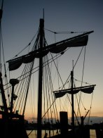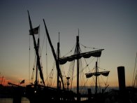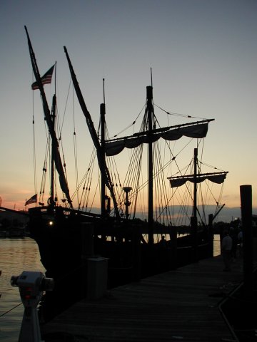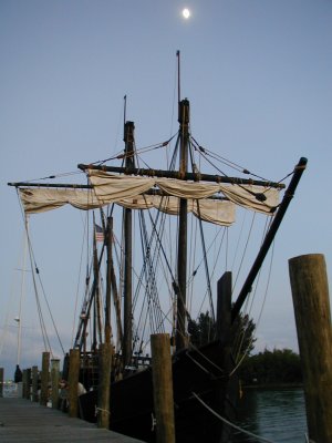 12/4/00 Ft Pierce, Fl - As I was sitting in my boat (Wed,12/6) at the marina working on this page, I looked up and saw a boom with a sail furled on it go very near to OVER my stern. I popped up and there was this reproduction of the NINA pulling alongside the dock right behind me. So I grabbed my camera and took some shots: