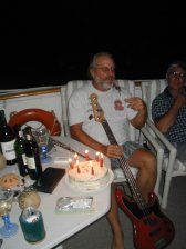 hour's cruise away. Besides, I couldn't miss the big jam session on Interlude, the floating palace! As I pulled up to the Interlude, (last as usual) dragging my guitar and amp, the sounds of the whole group singing 'Happy Birthday' made it's way across